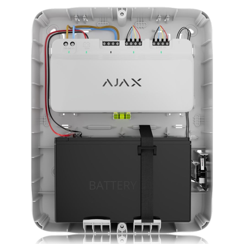 Nainstalujte zařízení Ajax LineSupply Fibra a záložní baterii o kapacitě 7 Ah pomocí krabice Case. Organizujte kabely a zajistěte zařízení tím nejjednodušším způsobem. Rychlé a spolehlivé upevnění pomocí odolných západek a nevypadávajících šroubů.