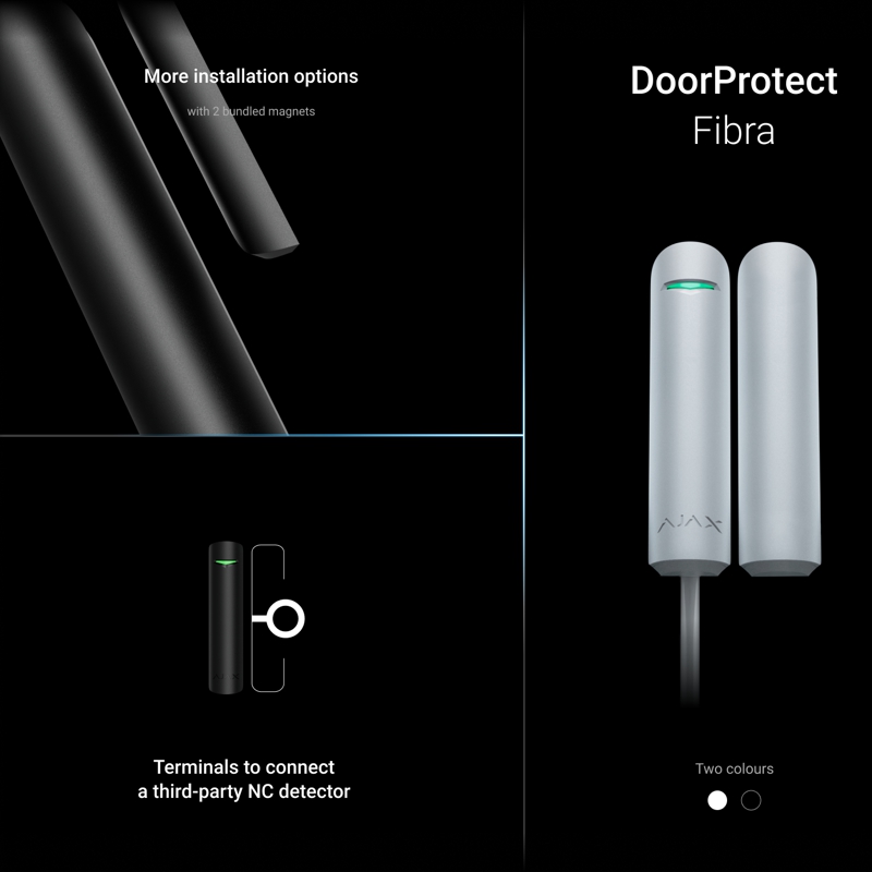 Ajax DoorProtect Fibra je drátový magnetický detektor otevření. Lze ho použít pro spolehlivou ochranu oken a dveří všech typů a provedení. Detektor je připojen drátově k zabezpečovacímu systému Ajax pomocí zabezpečeného protokolu Fibra a dosah kabelového připojení je až 2000 metrů při připojení pomocí krouceného páru U/UTP kat.5. Je navržen pro použití v interiéru.