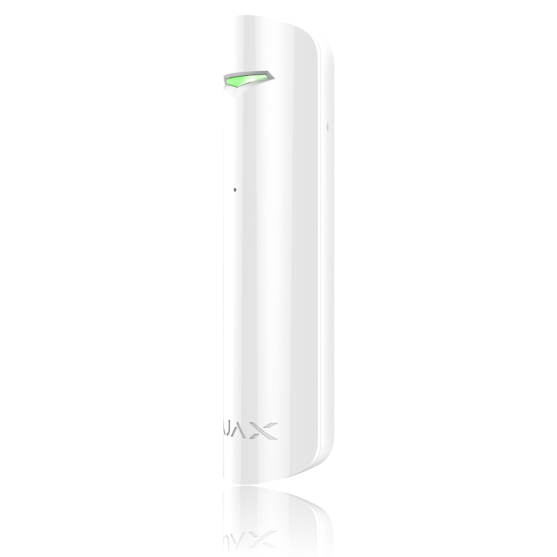Bezdrátový detektor tříštění skla - bílý. Ajax GlassProtect je miniaturní bezdrátový detektor rozbití skla určený pro zabezpečení prosklených ploch. Dvoufaktorová detekce rozbití skla výrazně eliminuje výskyt falešných poplachů.