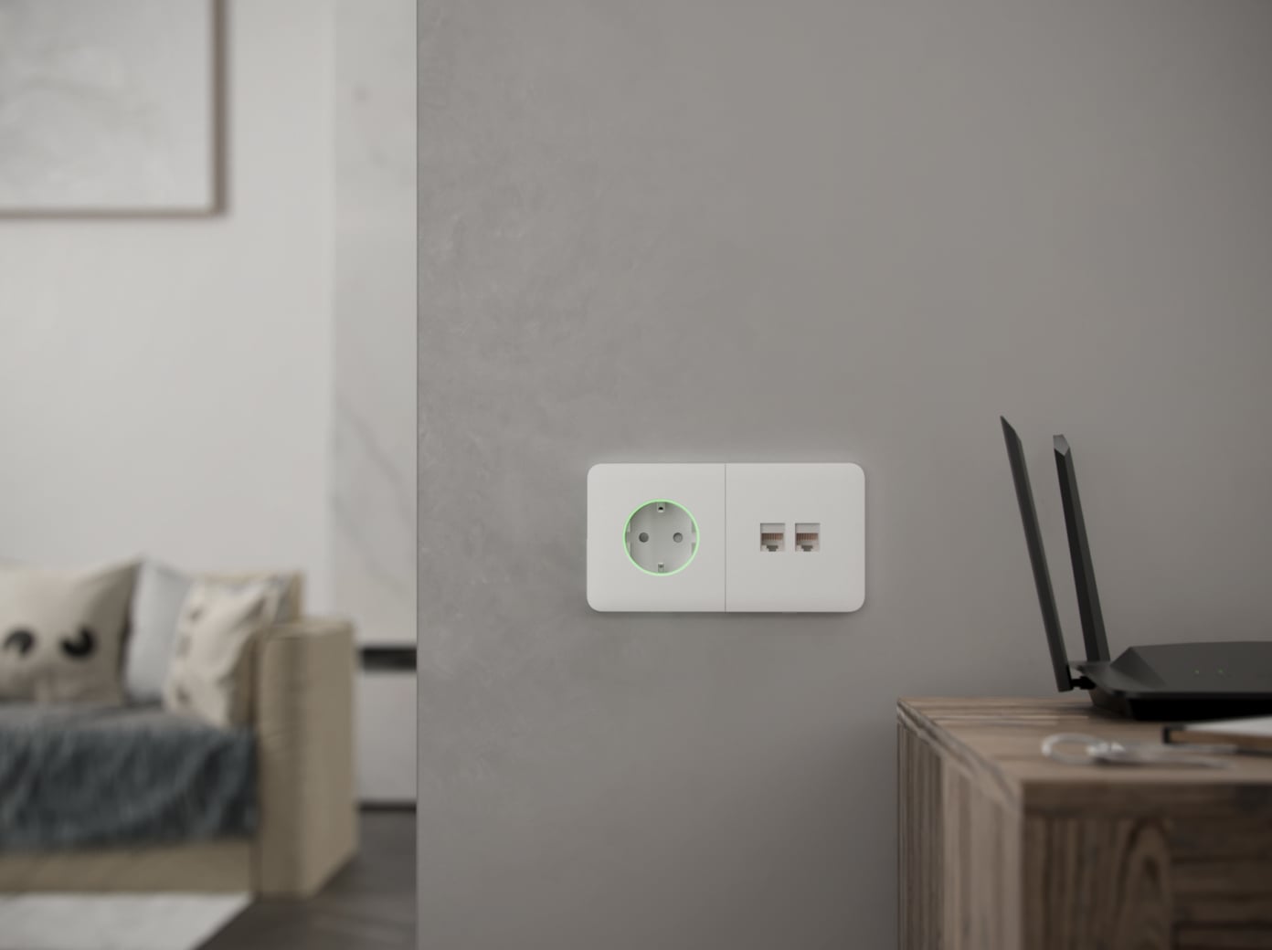 Díky shodné barevné paletě a minimalistickému designu zásuvka přirozeně doplňuje ostatní spínače a zásuvky Ajax v rámci jednoho rámečku.