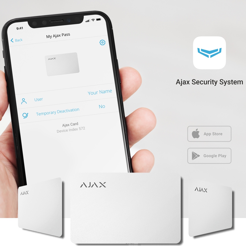 Ajax Pass je šifrovaná bezkontaktní karta pro přístup k ovládání stavu zabezpečovacího systému Ajax.