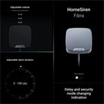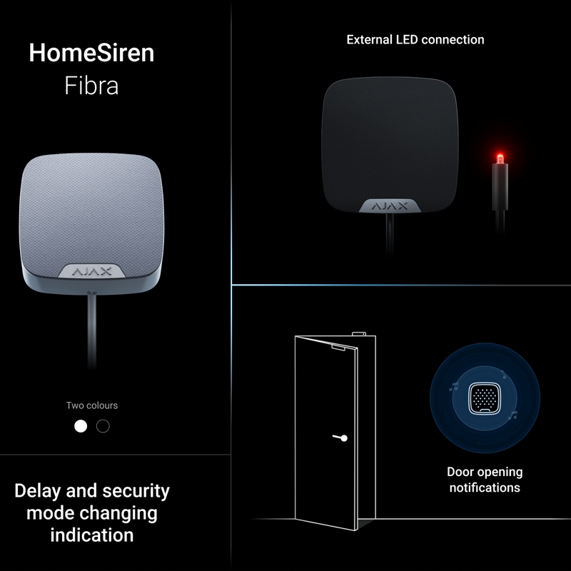 Ajax HomeSiren Fibra je drátová siréna určená pro použití ve vnitřních prostorech. Intenzitu akustické signalizace lze nastavit v rozmezí 81 až 105 dB. Siréna navíc disponuje konektorem pro připojení externí LED signalizace. Siréna je připojena drátově k zabezpečovacímu systému Ajax pomocí zabezpečeného protokolu Fibra a dosah kabelového připojení je až 2000 metrů při připojení pomocí krouceného páru U/UTP kat.5.