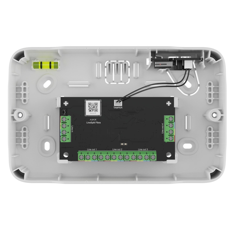 LineSplit je primárně určen pro instalaci do speciálního krytu Ajax Case. Kryt umožňuje optimální uspořádání kabelů pro připojení linky Fibra a disponuje speciálními držáky pro modul a sabotážním kontaktem tamper.