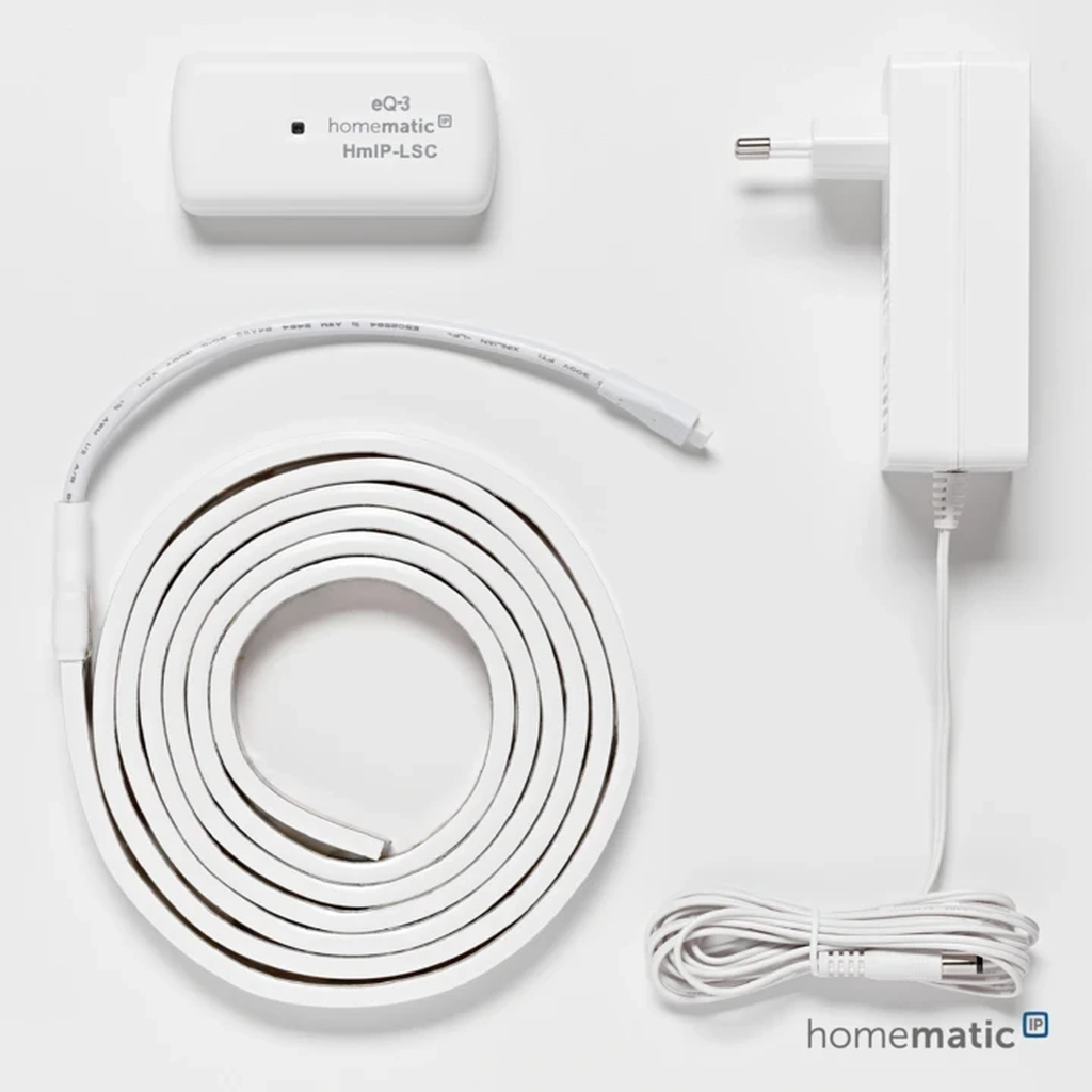 S Homematic IP Setem - LED pásek + zdroj vstoupíte okamžitě do světa inteligentního osvětlení. Balení obsahuje vše potřebné: ovladač LED pásku, napájecí adaptér a 2 metry dlouhý světelný pás. Díky samolepicí vrstvě na zadní straně nainstalujete LED pásek rychle a jednoduše kamkoliv si přejete. Stačí připojit, spárovat s aplikací Homematic IP a můžete okamžitě ovládat osvětlení podle svých představ – měnit barvy, nastavovat intenzitu světla nebo vytvářet atmosférické scény pro každou příležitost.