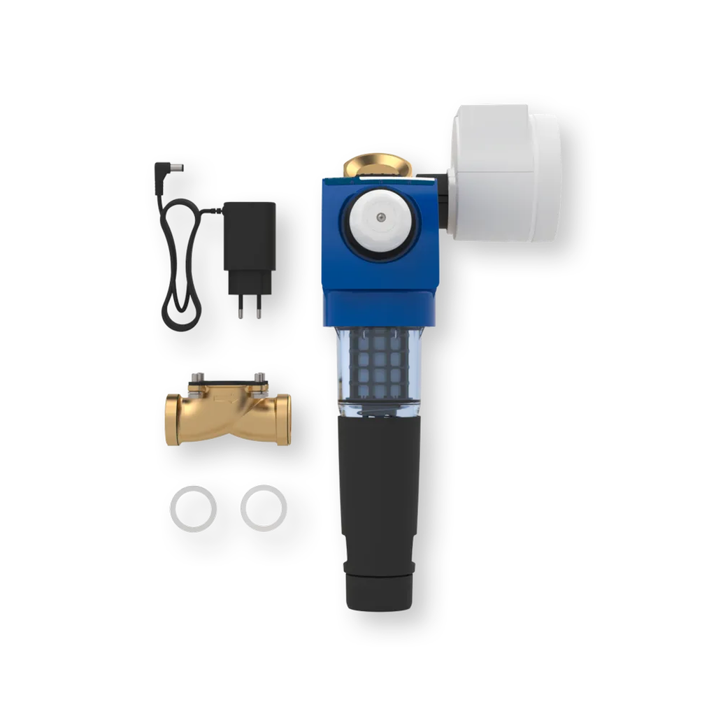 - Vodní filtr (zpětný proplachový filtr) – filtrace nečistot s jemností 100 µm pro ochranu vodovodní instalace