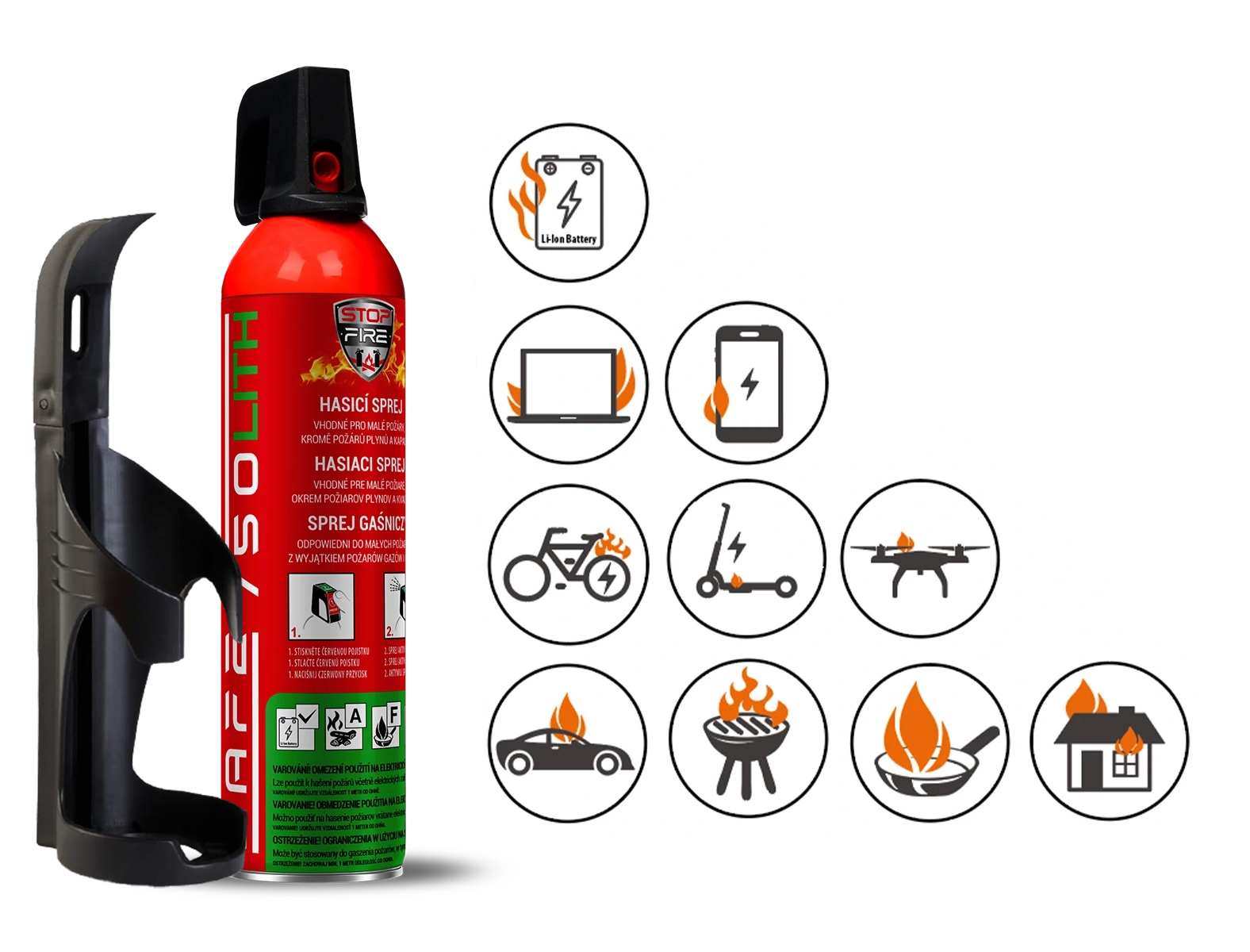 Výhodný set hasicího spreje SAFE 750 LITH spolu s černým držákem SAFE 75C. Hasicí sprej je primárně určen k hašení začínajících požárů lithiových baterií, v domácnostech, kuchyních, garážích, automobilech, kancelářích, chatách atd. Možnost použití až do - 20 °C.